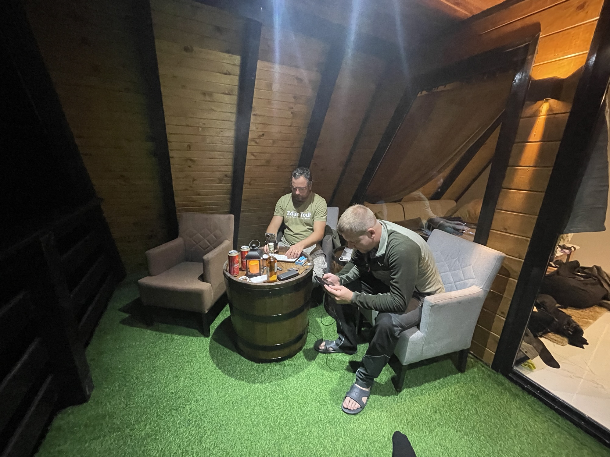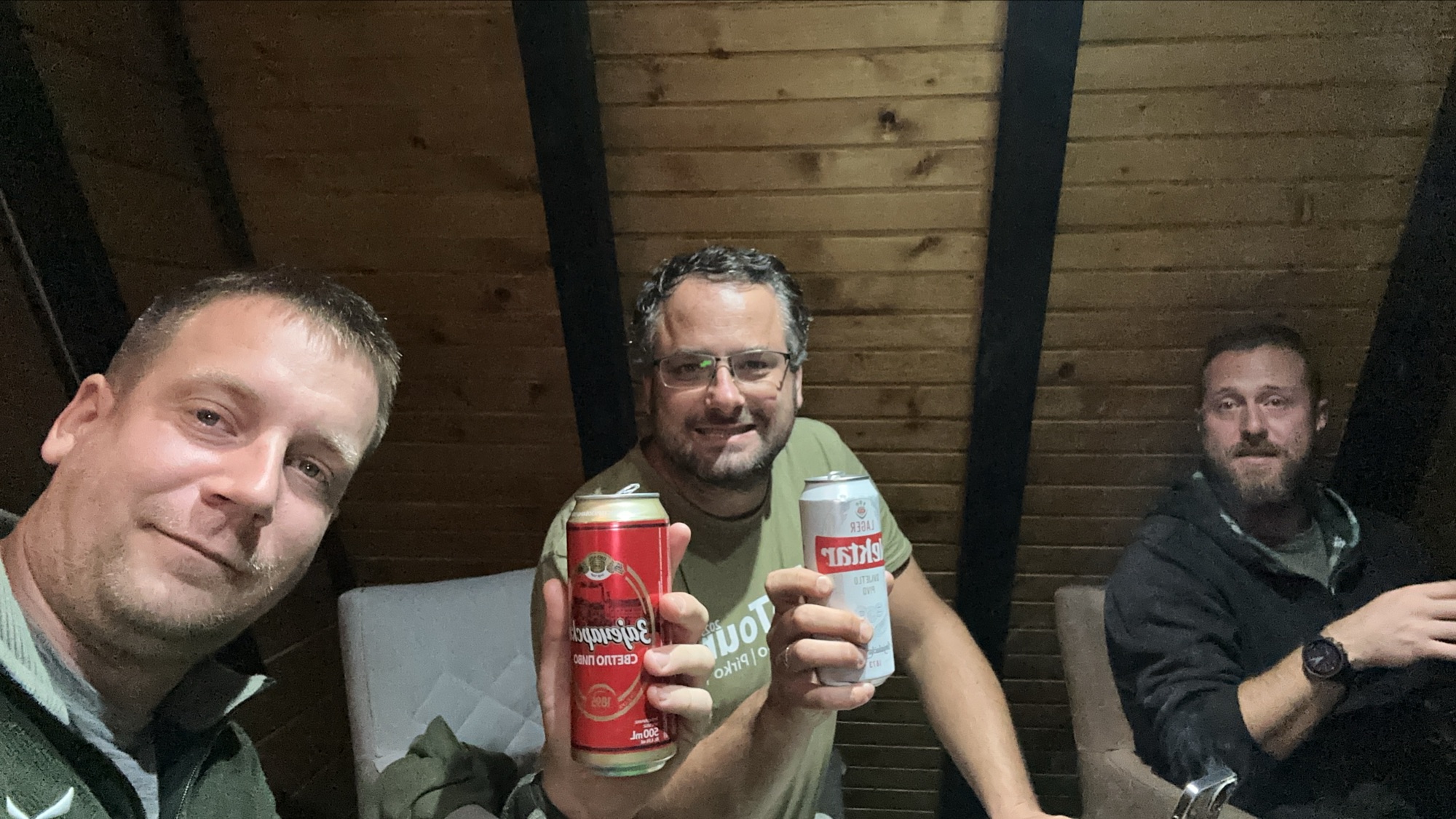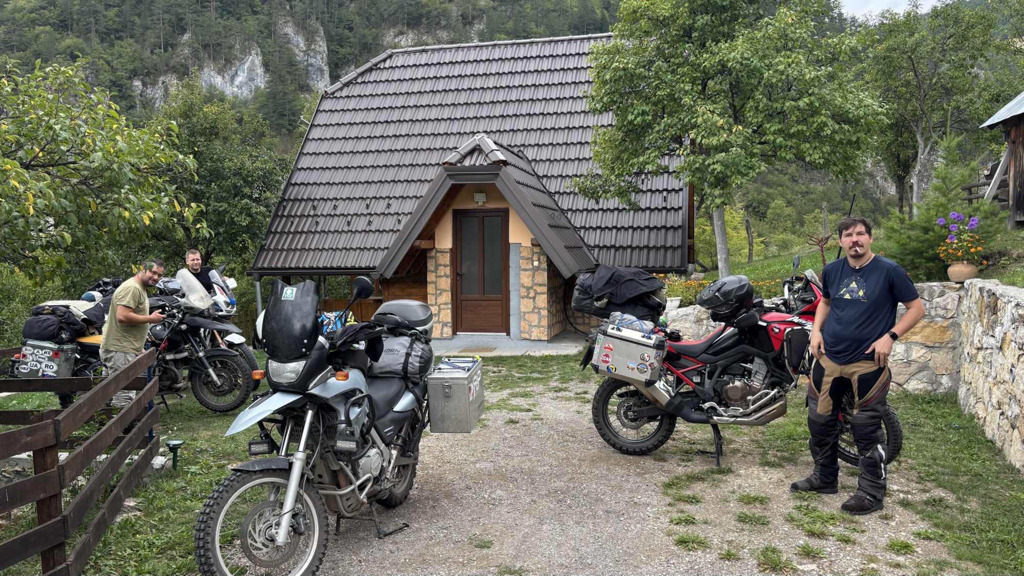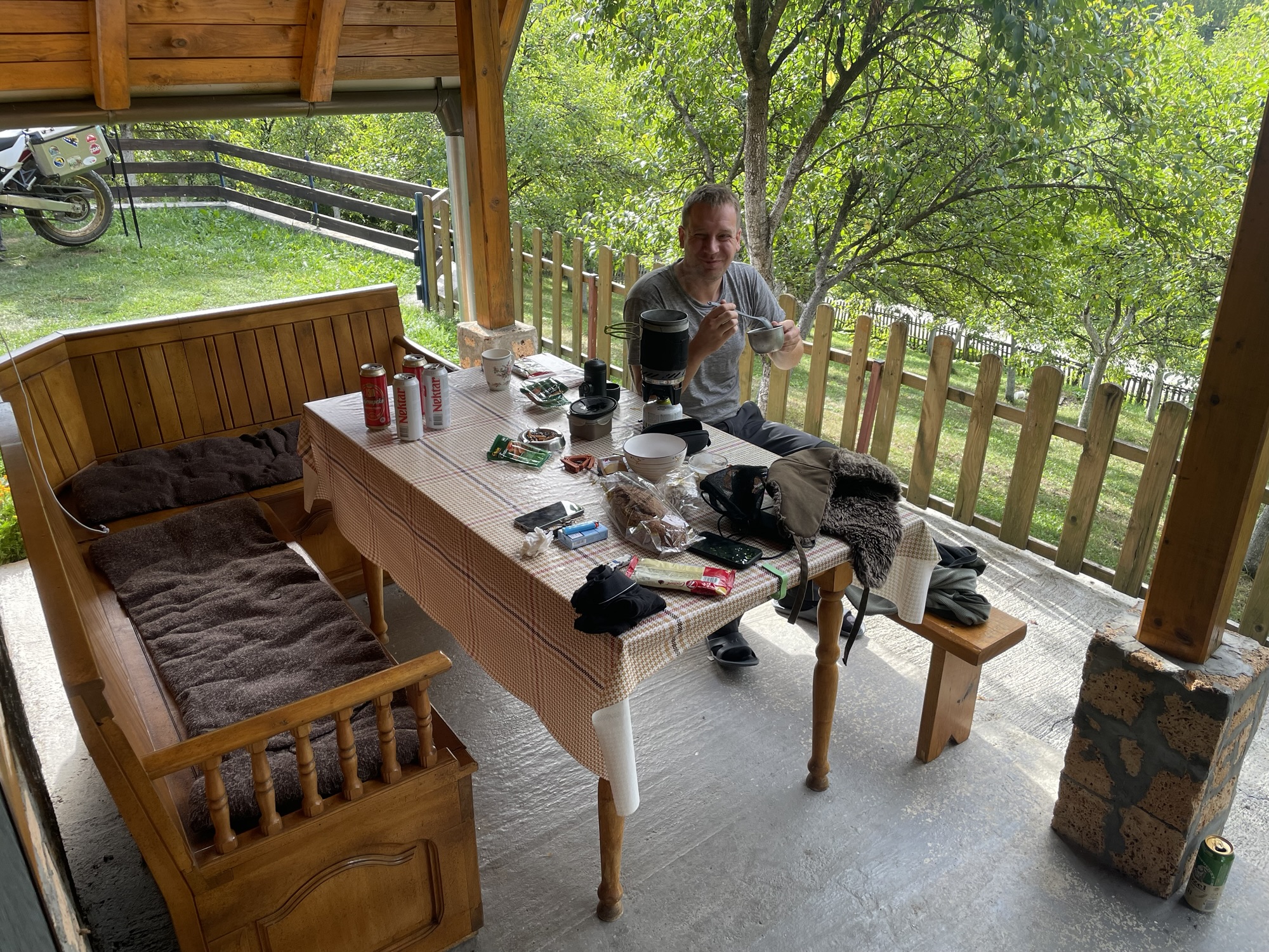 Vzhledem k počasí hledáme opět nějaké ubytování, na bookingu nám první nevyšlo, ale druhá chatička kousek za městem Vlasenica už na nás čeká i s majitelem. Bylo trochu tricky jí najít, neboť se nachází asi o 3 km někde úplně jinde, než je uvedeno na Bookingu. Ale stálo to za to. Chajda je postavená doslova nad potokem, je malá, ale luxusní. Připadá nám, že jsme tu první hosté po jejím vystavění. A tak tu ted sedíme s napranými nácky, Jimbovi už je trochu líp, tak pije pivo a čumil s ostatními. Rokujeme o tom, co budeme dělat zítra, už bychom se měli pomalu vracet směr domovina, předpověď počasí nevypadá dobře, a tak je možností spousta. Uvidíme ráno a podle toho se zařídíme.