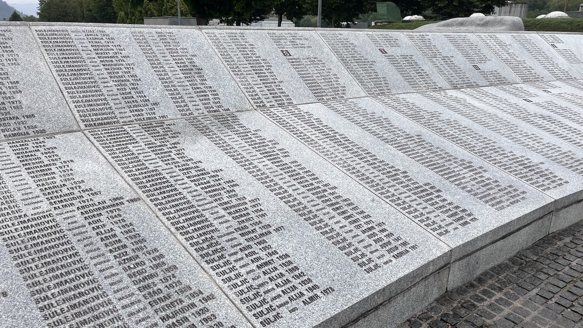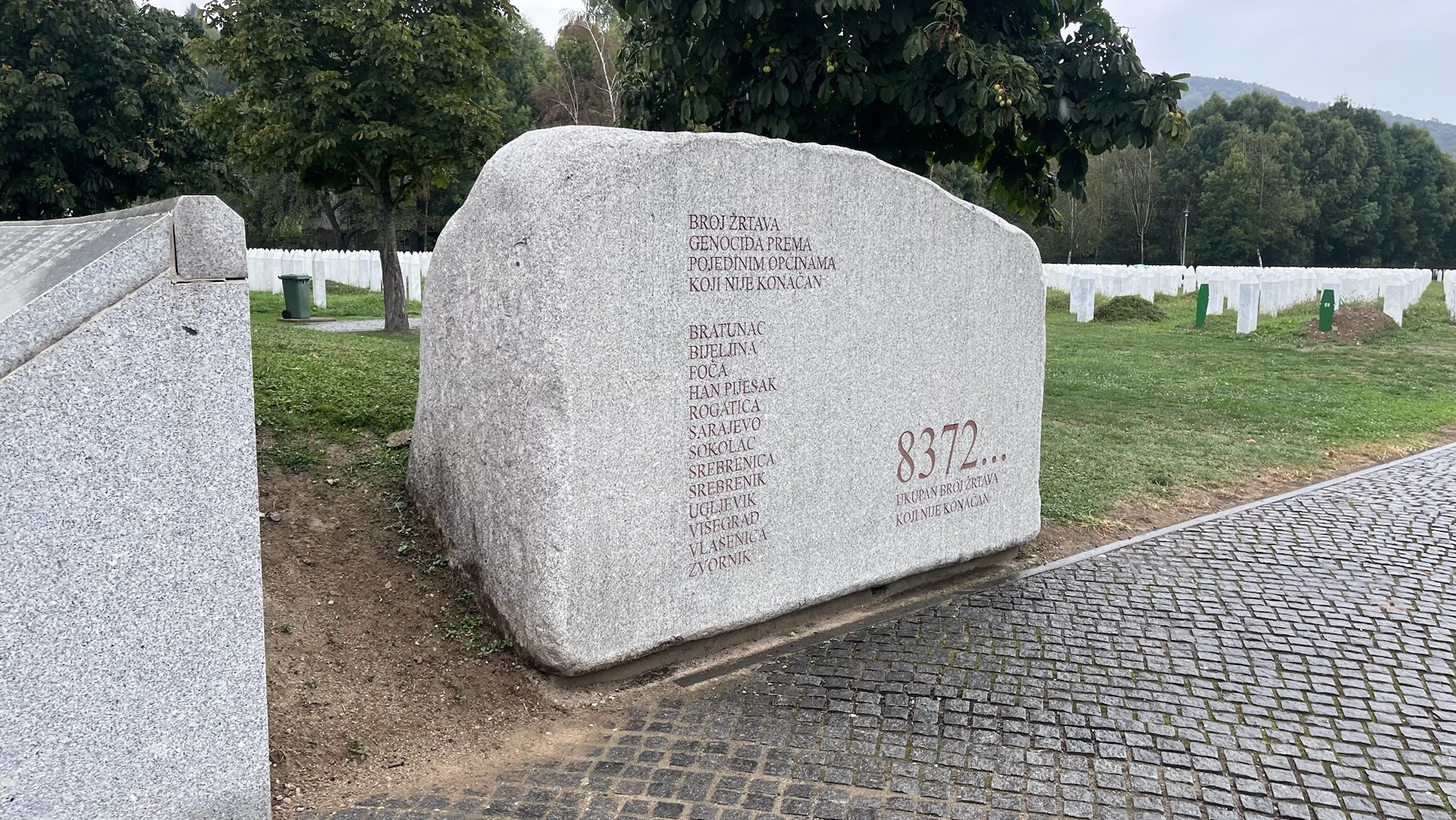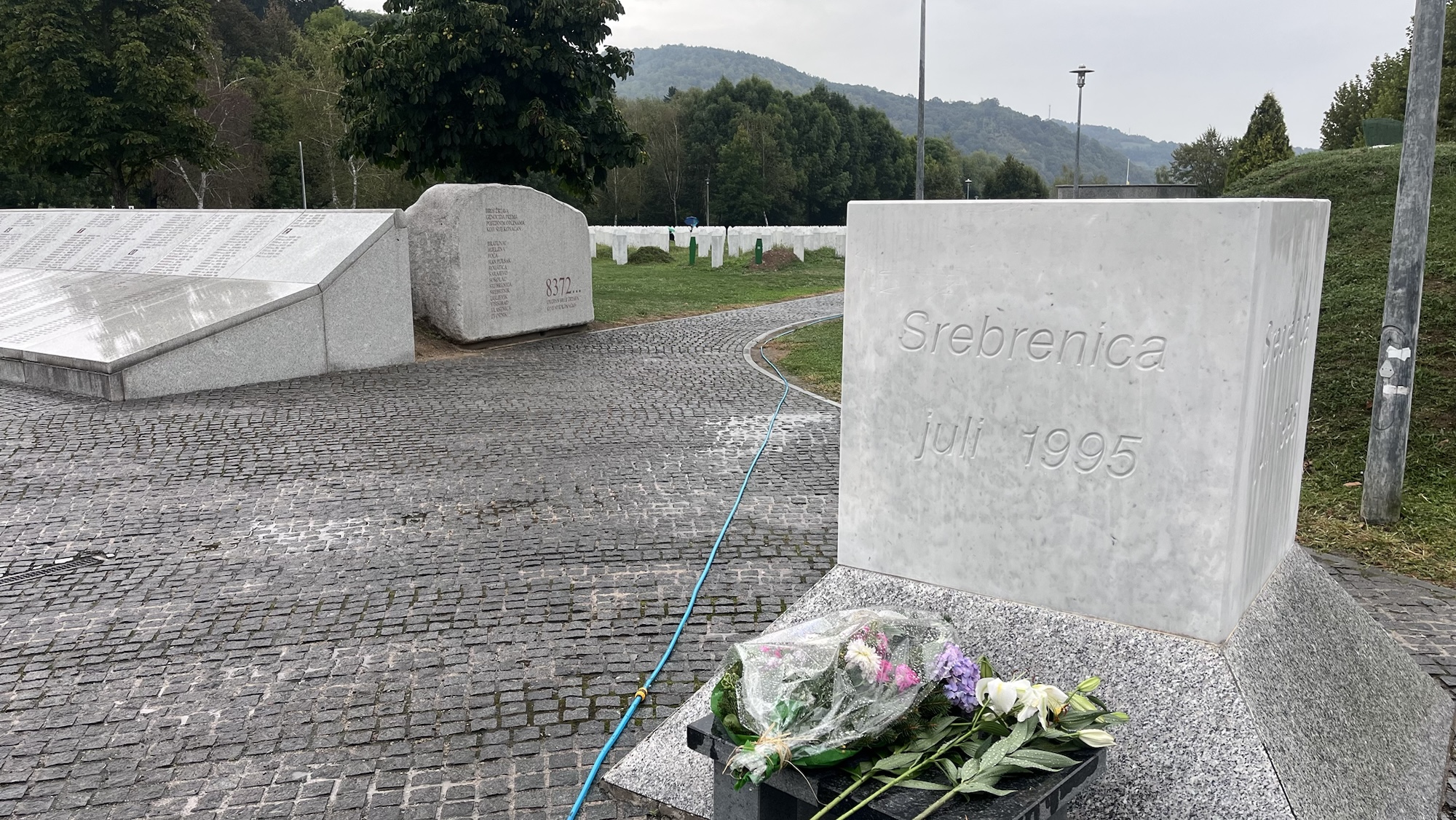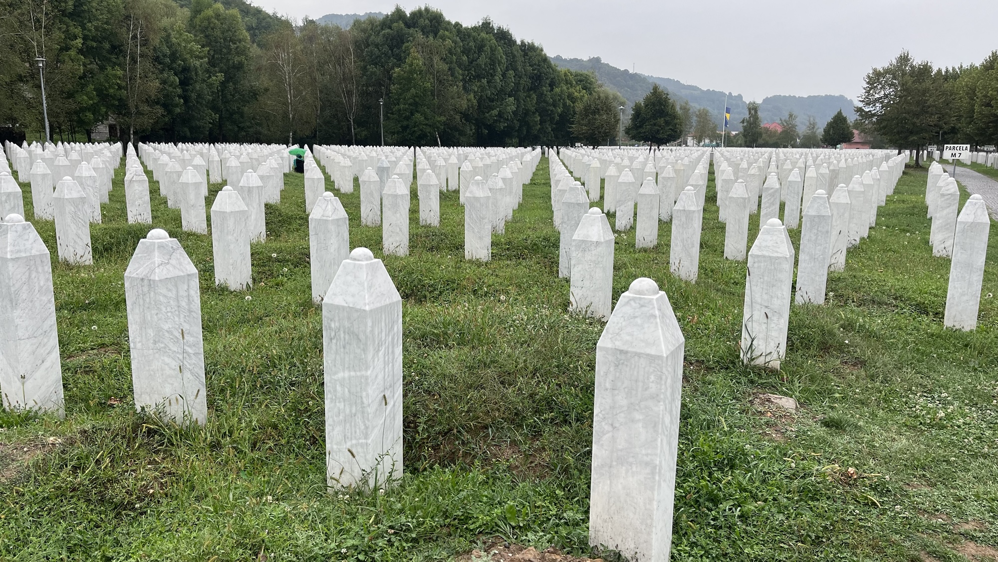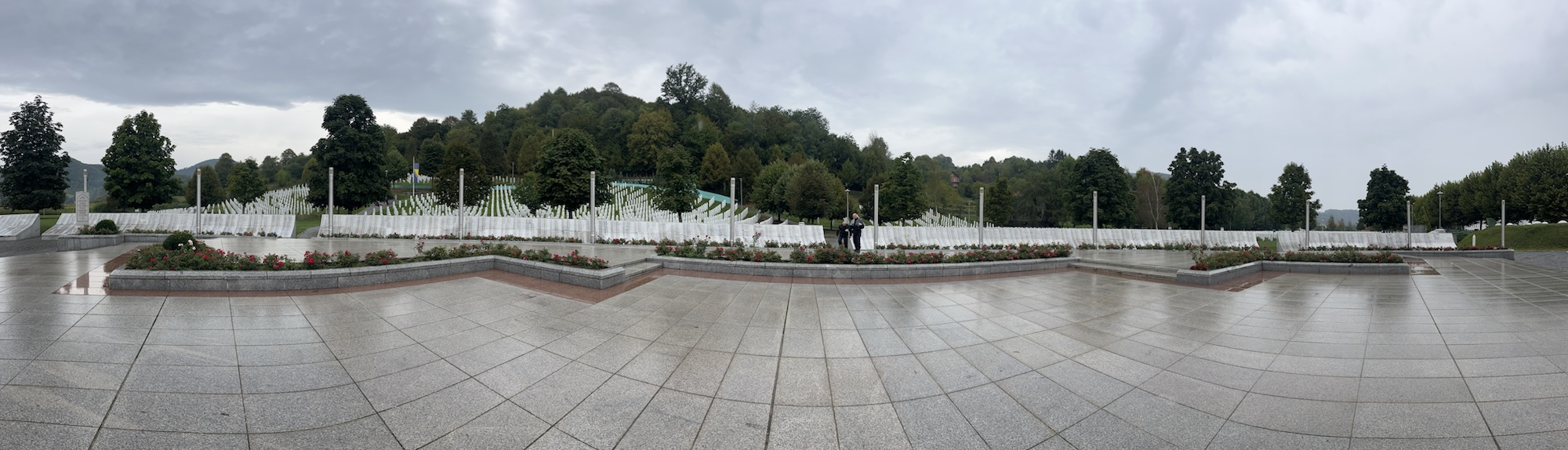 Na jídle trávíme kvůli nepřízni počasí asi 2 hodiny (ještěže tu to pivo nemají), nakonec se vzdáváme, šoupeme se pod slunečníky do šprcek (nepromoky) a vyrážíme směr Srebrenica. Modří, zejména starší čtenáři, už vědí, na co se jedeme podívat. Není to nic jiného než památník ve vesnici Donji Potočari mezi Bratunacem a Srebrenicí.